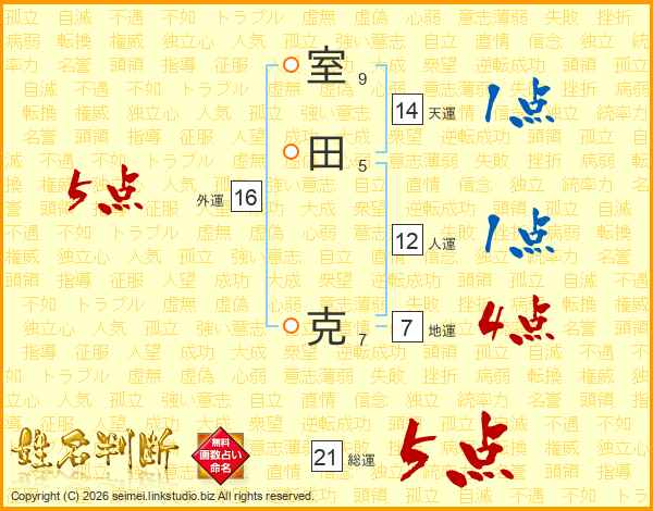室田克さんの総運は21画の5点!