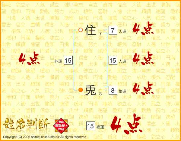 生活面を象徴する運勢です。外部から受ける影響力を表し、結婚運、家庭運や職場、環境への順応性を表します。総運から人運を引いた画数。姓や名が1文字の場合を除く。