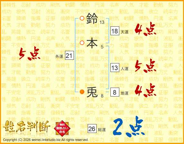 生活面を象徴する運勢です。外部から受ける影響力を表し、結婚運、家庭運や職場、環境への順応性を表します。総運から人運を引いた画数。姓や名が1文字の場合を除く。