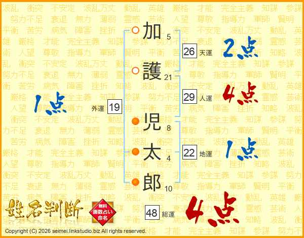 加(5画)護(21画) 児(8画)太(4画)郎(10画)