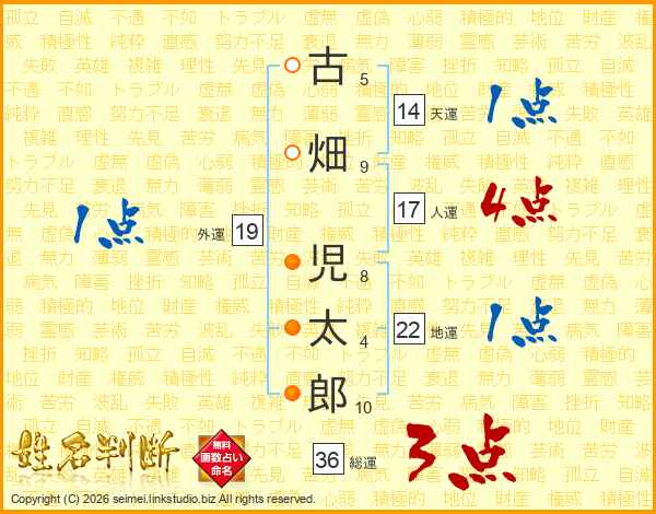 古(5画)畑(9画) 児(8画)太(4画)郎(10画)