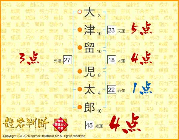 大(3画)津(10画)留(10画) 児(8画)太(4画)郎(10画)