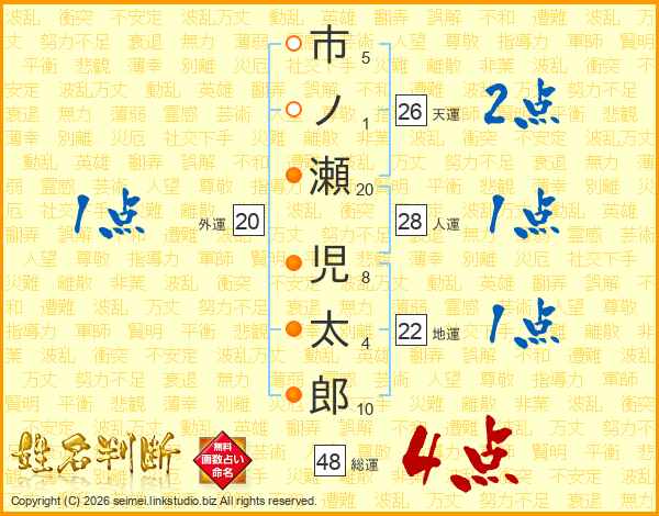 市(5画)ノ(1画)瀬(20画) 児(8画)太(4画)郎(10画)