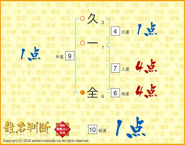 生活面を象徴する運勢です。外部から受ける影響力を表し、結婚運、家庭運や職場、環境への順応性を表します。総運から人運を引いた画数。姓や名が1文字の場合を除く。