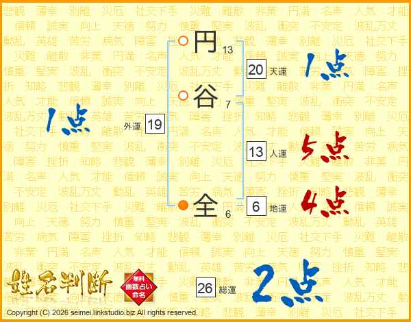生活面を象徴する運勢です。外部から受ける影響力を表し、結婚運、家庭運や職場、環境への順応性を表します。総運から人運を引いた画数。姓や名が1文字の場合を除く。