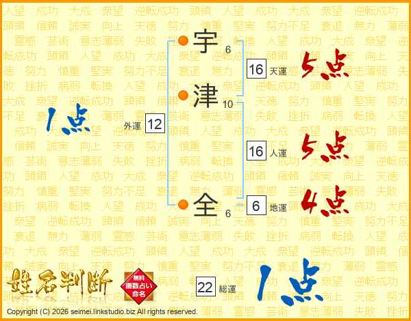 宇津全さんの人運は16画の5点!