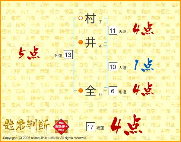 生活面を象徴する運勢です。外部から受ける影響力を表し、結婚運、家庭運や職場、環境への順応性を表します。総運から人運を引いた画数。姓や名が1文字の場合を除く。