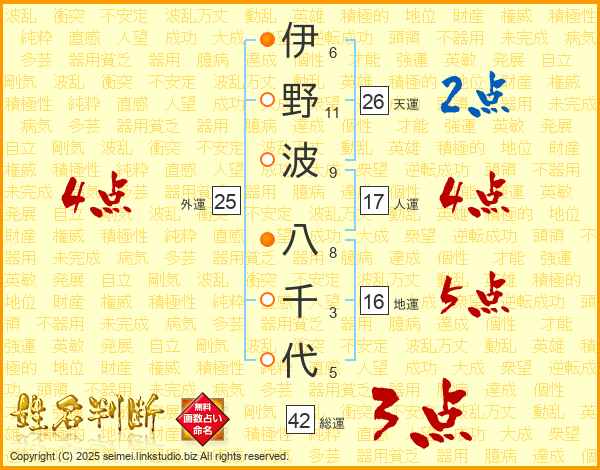 伊(6画)野(11画)波(9画) 八(8画)千(3画)代(5画)
