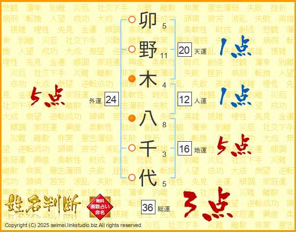 卯(5画)野(11画)木(4画) 八(8画)千(3画)代(5画)