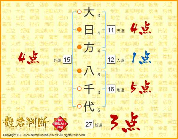 大(3画)日(4画)方(4画) 八(8画)千(3画)代(5画)