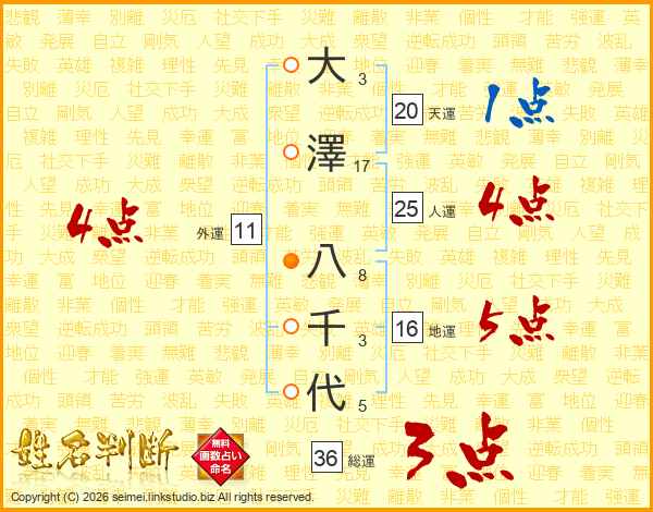大(3画)澤(17画) 八(8画)千(3画)代(5画)