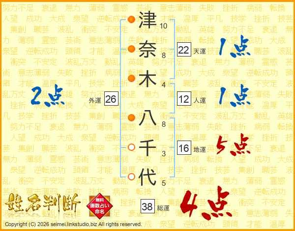 津(10画)奈(8画)木(4画) 八(8画)千(3画)代(5画)