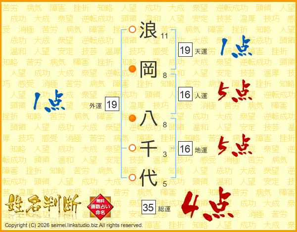 浪(11画)岡(8画) 八(8画)千(3画)代(5画)