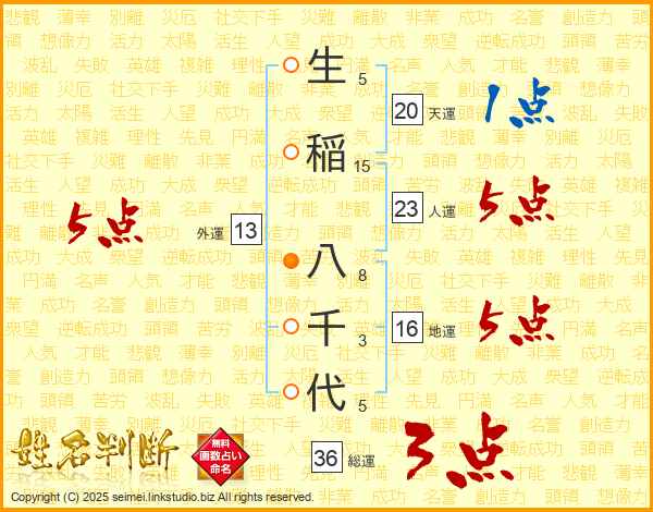 生(5画)稲(15画) 八(8画)千(3画)代(5画)