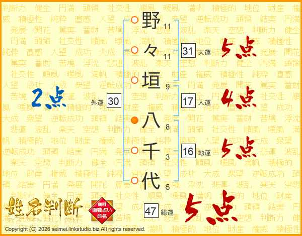 野(11画)々(11画)垣(9画) 八(8画)千(3画)代(5画)