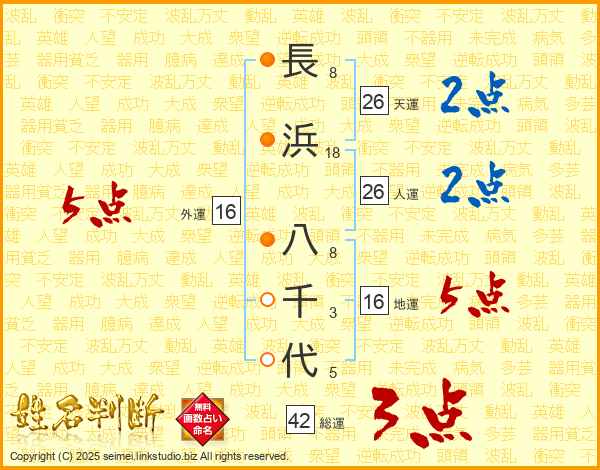 長(8画)浜(18画) 八(8画)千(3画)代(5画)