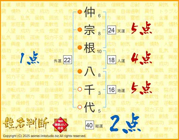 仲(6画)宗(8画)根(10画) 八(8画)千(3画)代(5画)