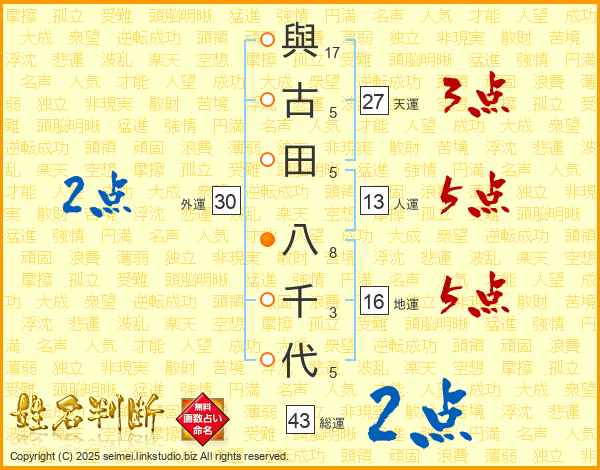 與(17画)古(5画)田(5画)  八(8画)千(3画)代(5画)
