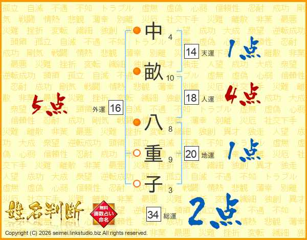 生活面を象徴する運勢です。外部から受ける影響力を表し、結婚運、家庭運や職場、環境への順応性を表します。総運から人運を引いた画数。姓や名が1文字の場合を除く。