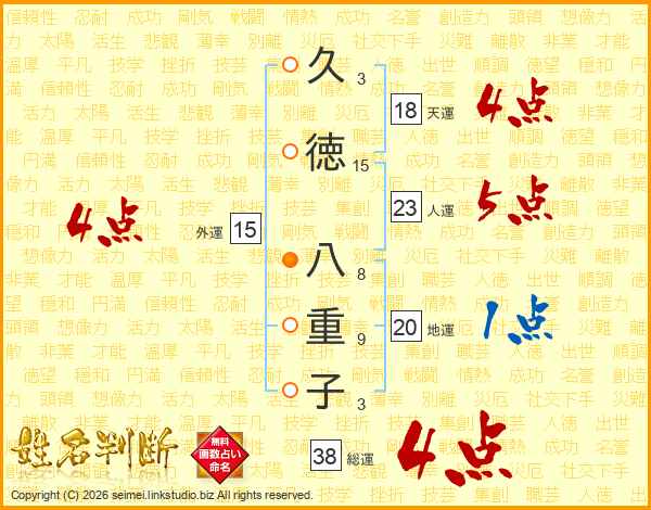 久(3画)徳(15画) 八(8画)重(9画)子(3画)