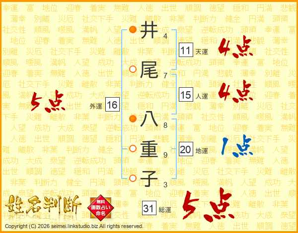 井(4画)尾(7画) 八(8画)重(9画)子(3画)