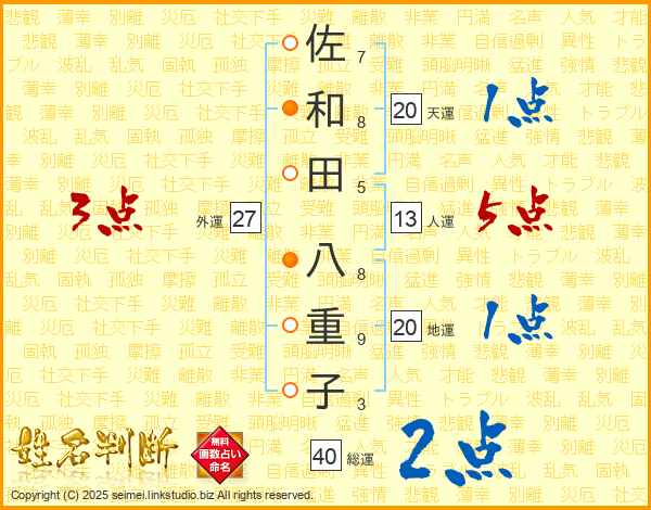 佐(7画)和(8画)田(5画) 八(8画)重(9画)子(3画)