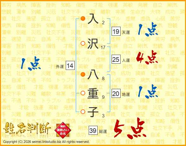 入(2画)沢(17画) 八(8画)重(9画)子(3画)