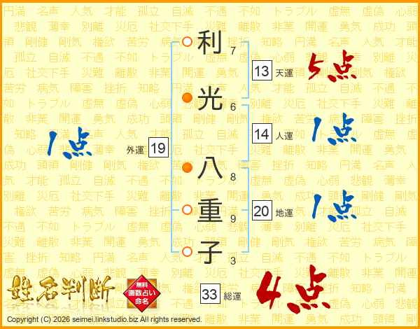 利(7画)光(6画) 八(8画)重(9画)子(3画)