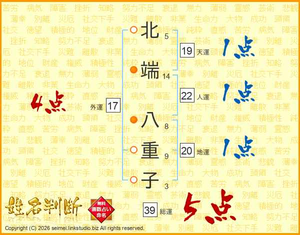 生活面を象徴する運勢です。外部から受ける影響力を表し、結婚運、家庭運や職場、環境への順応性を表します。総運から人運を引いた画数。姓や名が1文字の場合を除く。