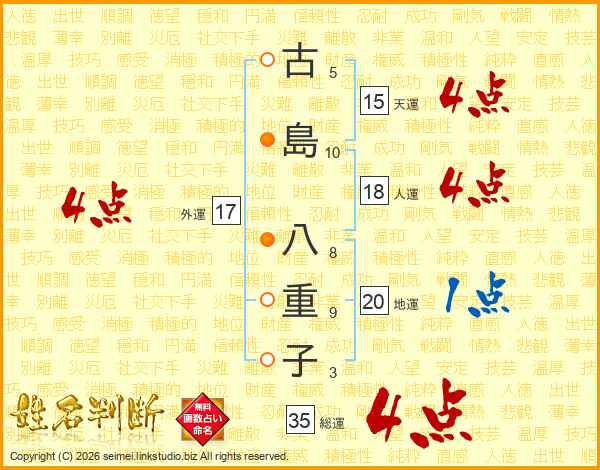 古(5画)島(10画) 八(8画)重(9画)子(3画)