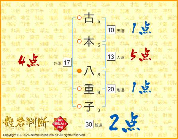 古(5画)本(5画) 八(8画)重(9画)子(3画)