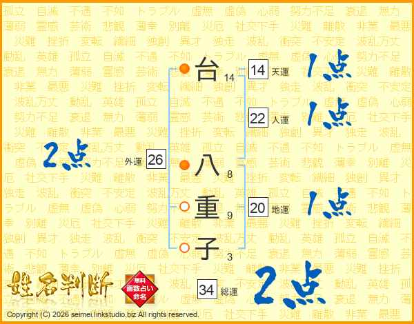 生活面を象徴する運勢です。外部から受ける影響力を表し、結婚運、家庭運や職場、環境への順応性を表します。総運から人運を引いた画数。姓や名が1文字の場合を除く。