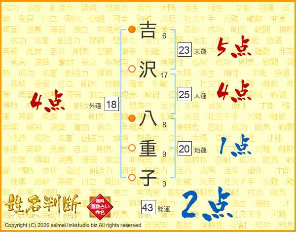 吉(6画)沢(17画) 八(8画)重(9画)子(3画)