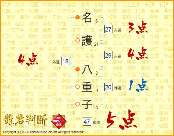 名(6画)護(21画) 八(8画)重(9画)子(3画)