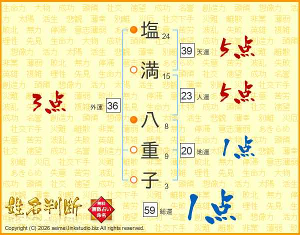 塩(24画)満(15画) 八(8画)重(9画)子(3画)
