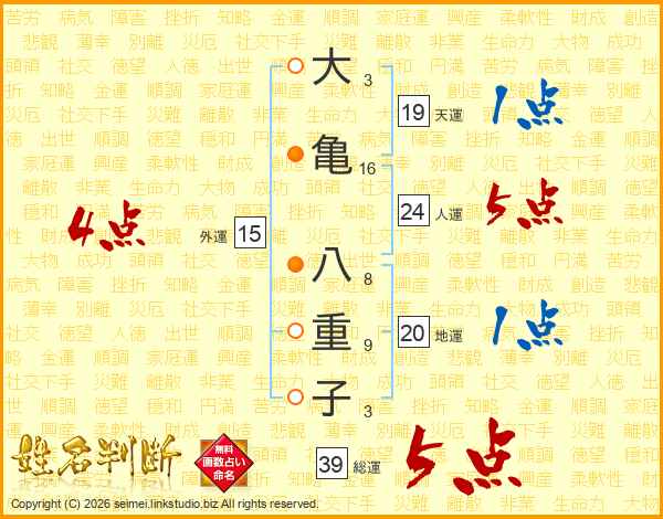 大(3画)亀(16画) 八(8画)重(9画)子(3画)