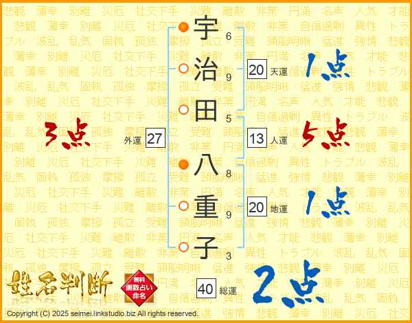 宇(6画)治(9画)田(5画) 八(8画)重(9画)子(3画)