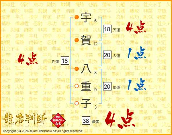 宇(6画)賀(12画) 八(8画)重(9画)子(3画)
