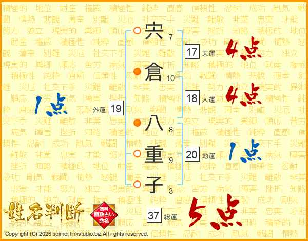 宍倉八重子さんの総運は37画の5点!