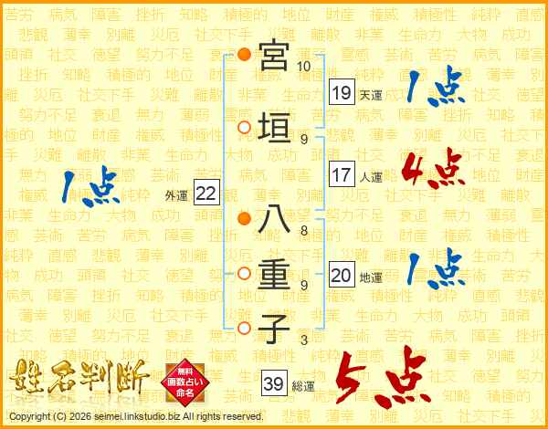 宮(10画)垣(9画) 八(8画)重(9画)子(3画)