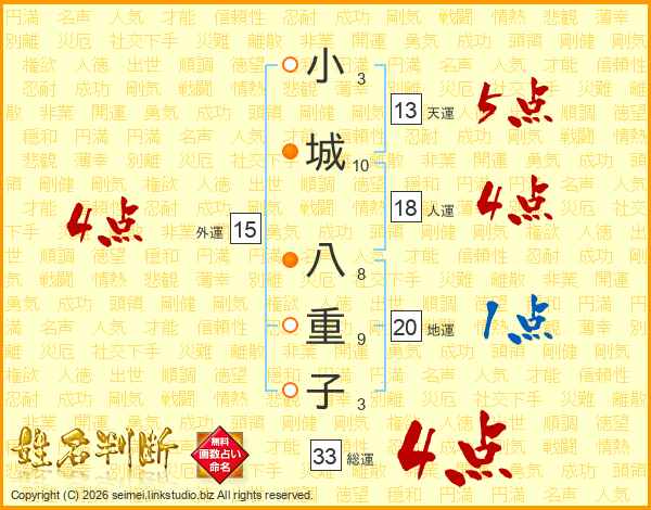 生活面を象徴する運勢です。外部から受ける影響力を表し、結婚運、家庭運や職場、環境への順応性を表します。総運から人運を引いた画数。姓や名が1文字の場合を除く。
