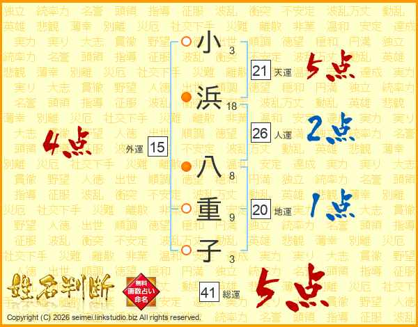 小(3画)浜(18画) 八(8画)重(9画)子(3画)