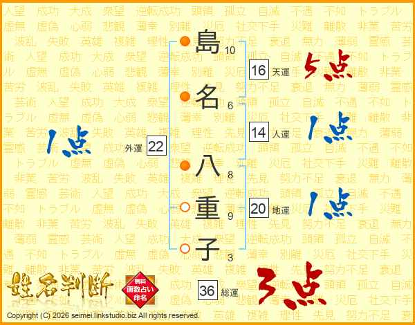 島(10画)名(6画) 八(8画)重(9画)子(3画)