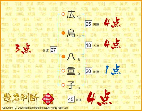 広(15画)島(10画) 八(8画)重(9画)子(3画)
