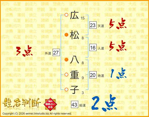 広(15画)松(8画) 八(8画)重(9画)子(3画)