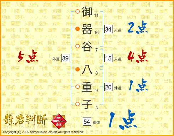 御(11画)器(16画)谷(7画) 八(8画)重(9画)子(3画)
