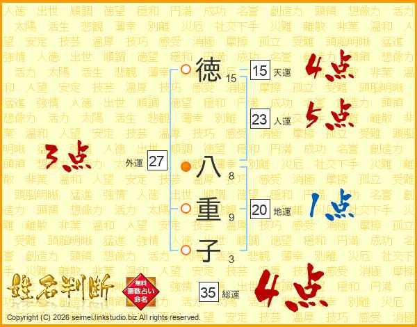 徳(15画) 八(8画)重(9画)子(3画)