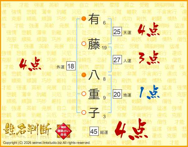 有(6画)藤(19画) 八(8画)重(9画)子(3画)
