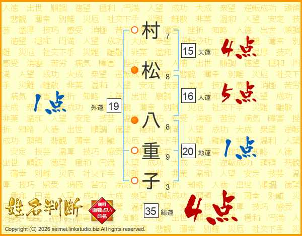 村(7画)松(8画) 八(8画)重(9画)子(3画)