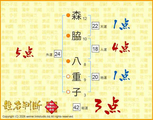 森(12画)脇(10画) 八(8画)重(9画)子(3画)